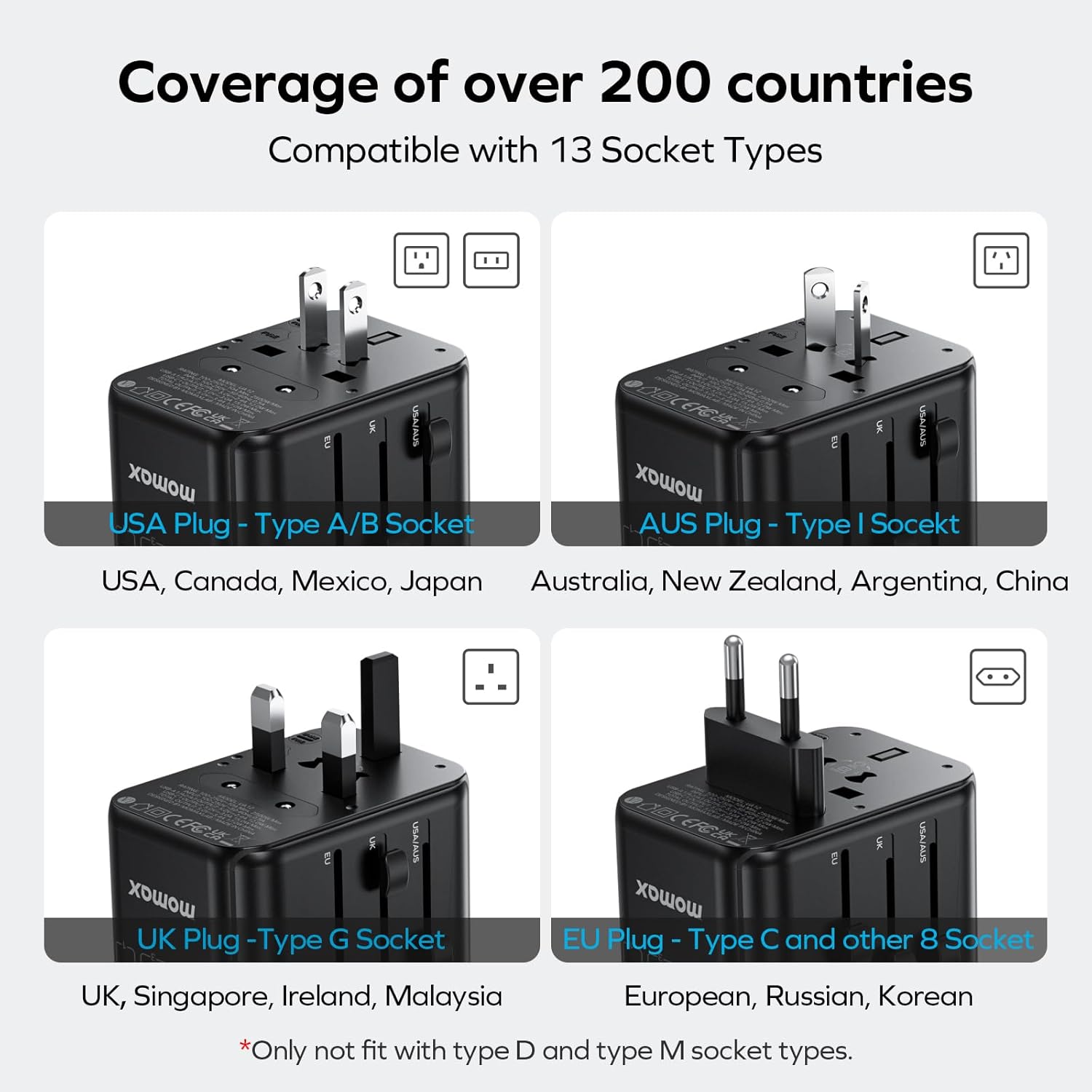 Introducing the MOMAX Universal Travel Adapter, your ultimate companion for seamless international travel! This 70W GaN International Power Adapter is designed to keep you connected and powered up wherever your adventures take you.